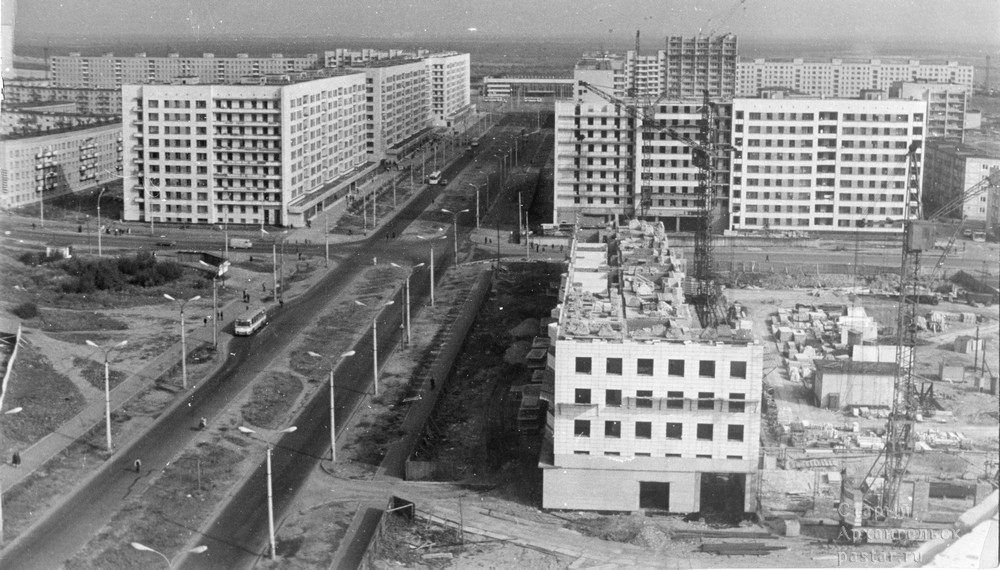 Справа идет строительство дома по ул. Энгельса, 118 к. 1. Дом будет сдан в 1977 году.