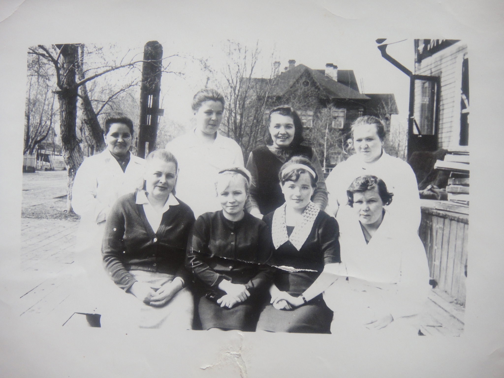 Группа школьниц стоит на дороге к крыльцу школы. За деревянным домом находился магазин "Рыбкооп".