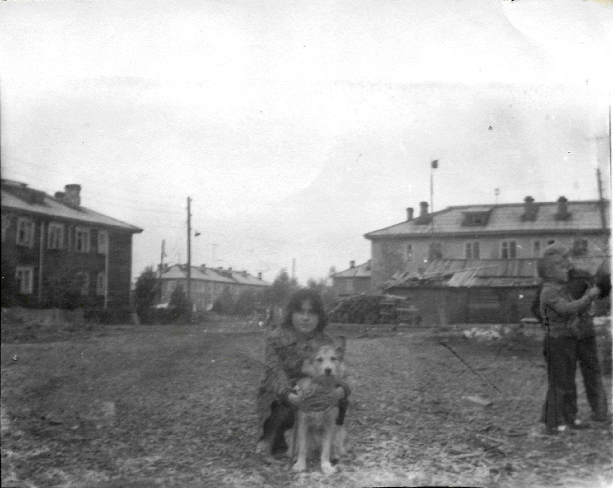 Группа школьниц стоит на дороге к крыльцу школы. За деревянным домом находился магазин "Рыбкооп".